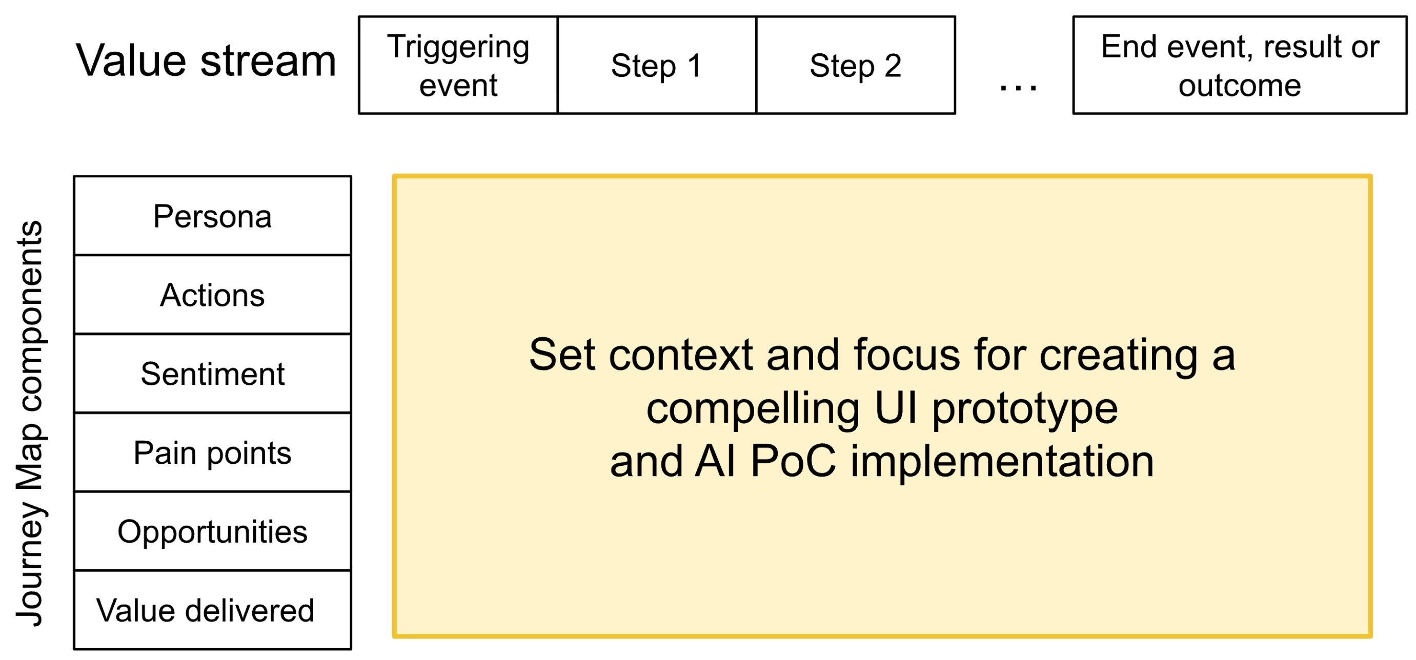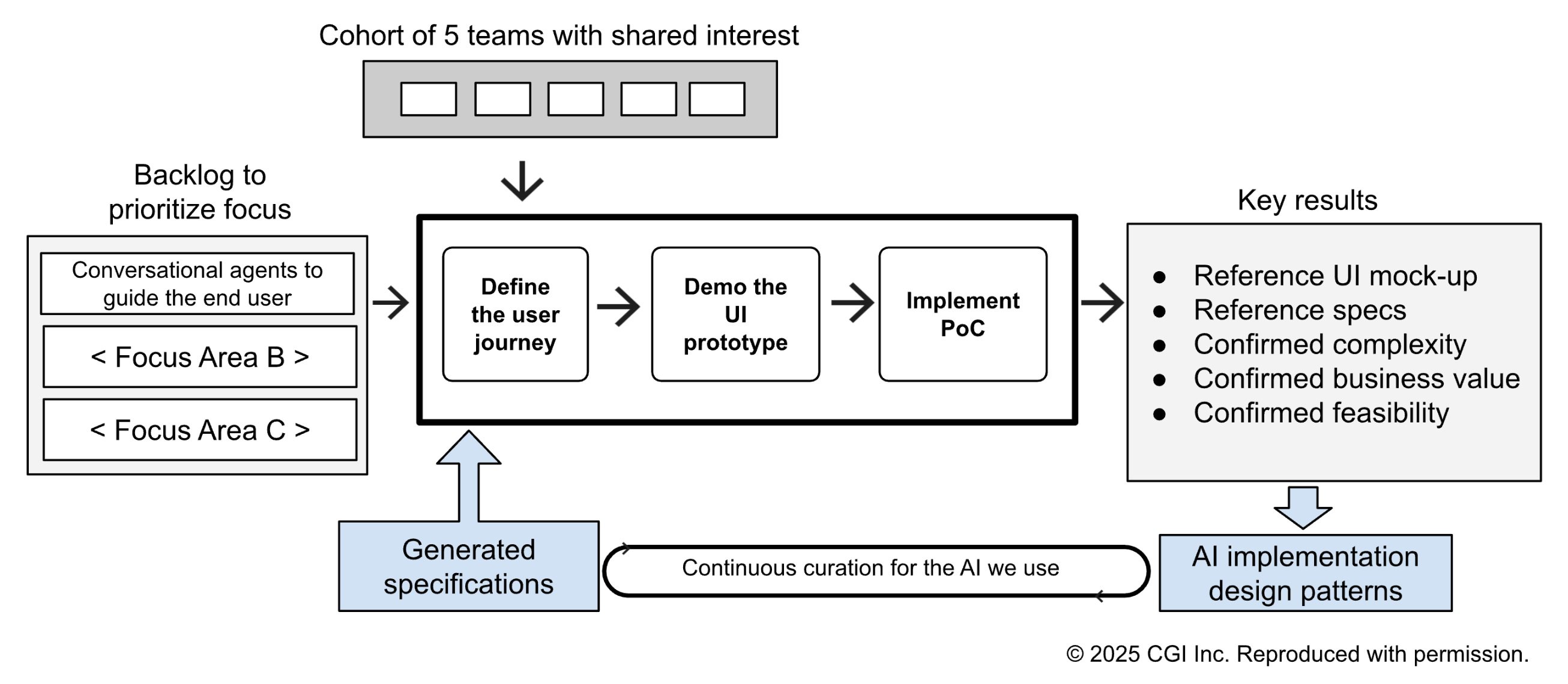 Business owners were able to quickly visualize the potential impact and benefit of AI themselves through the UI prototypes and also see how other teams were thinking. Notwithstanding the invaluable collaboration experience, developers also had a first visual to target their implementation results. The regular positive feedback gave testimony that the program was resonating with the contributors. The diagram below shows the iterative cycle and the input/output of the cohort-based process: defining user journey, prototyping, and evolving AI-assisted specifications.