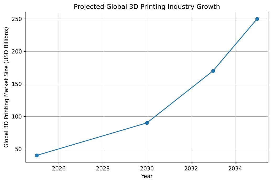 Market data supports what we are seeing in practice. Multiple industry forecasts project strong, sustained growth for 3D printing over the next decade. Estimates vary, but most point to compound annual growth rates above 20 percent, with the global market expected to expand from roughly US$40 billion today to anywhere from US$170 billion to more than US$250 billion by the mid-2030s. That level of expansion reflects more than enthusiasm—it reflects adoption.