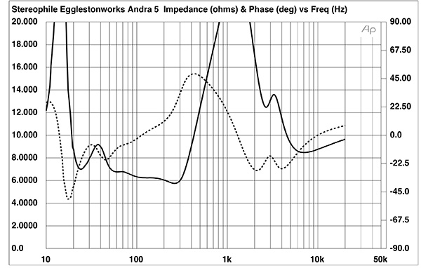 I used DRA Labs’ MLSSA system with a calibrated DPA 4006 microphone to examine the EgglestonWorks speaker’s farfield behavior and dispersion at my usual 50" distance; I used an Earthworks QTC-40 mike, which has a small ¼" diameter capsule, for the nearfield responses. I measured the Andra 5’s impedance magnitude and electrical phase angle with Dayton Audio’s DATS V2 system.