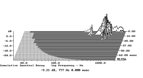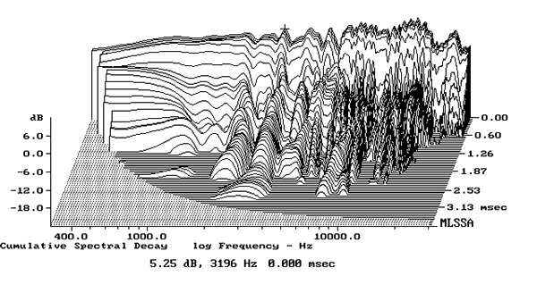 Fig.2 EgglestonWorks Andra 5, cumulative spectral-decay plot calculated from output of accelerometer fastened to center of sidewall level with lower midrange unit (measurement bandwidth, 2kHz).