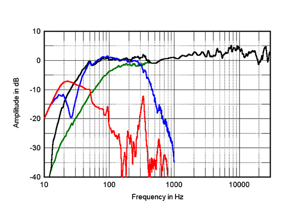 Fig.3 EgglestonWorks Andra 5, anechoic response on tweeter axis at 50", averaged across 30° horizontal window and corrected for microphone response, with the nearfield responses of the midrange units (green), woofer (blue), and port (red), and the complex sum of the nearfield responses (black), respectively plotted below 400Hz, 1kHz, 800Hz, and 400Hz.