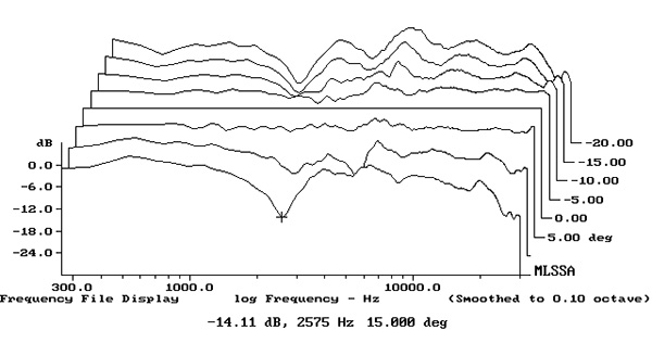 Fig.5 EgglestonWorks Andra 5, vertical response family at 50", normalized to response on tweeter axis, from back to front: differences in response 20–5° above axis, reference response, differences in response 5–15° below axis.