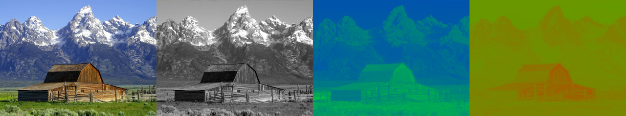 - One value representing hue, one value representing saturation, and one value quasi-representing luminance (HSV, HSL, HSY)