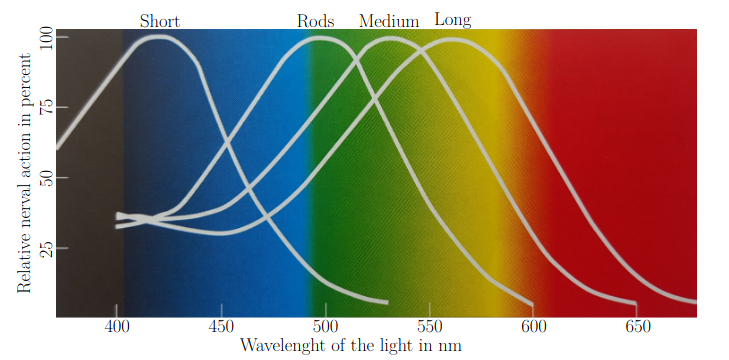 To be able to talk about color at a deeper level appropriately, we need to be able to have a useful diagram that shows the capabilities and limitations of human vision. The CIE 1931 Chromaticity Diagrams helps accomplish this by mapping out the range of possible colors of human vision into a 2D graph where the x and y are different chromaticity coordinates. The horse-shoe shape showcases the colors made from pure light wavelengths, from ~360 nm for violet all the way to ~830 nm for red. The line connecting the violets and the reds in the bottom create the purples which are not possible from any singular weavelength. Coordinates outside of this Spectral Locus are chromaticities that are not possible to be conceived by human vision.