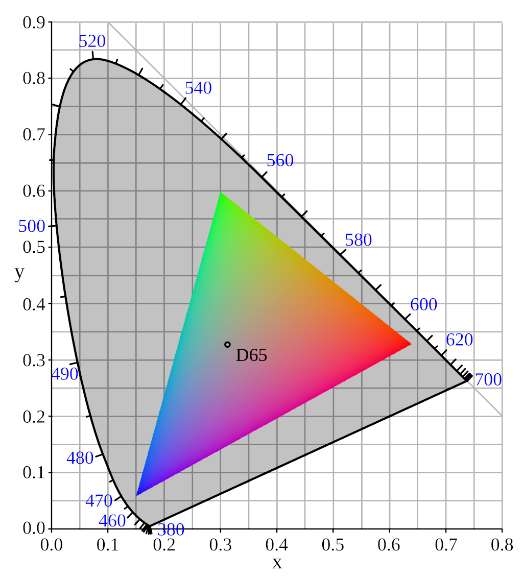 | 1 | 0.640 | 0.330 | 0.300 | 0.600 | 0.150 | 0.060 | 0.3127 | 0.3290 | Rec. ITU-R BT.709-6 Rec. ITU-R BT.1361-0 IEC 61966-2-1 sRGB or sYCC IEC 61966-2-4 SMPTE RP 177 (1993) |
