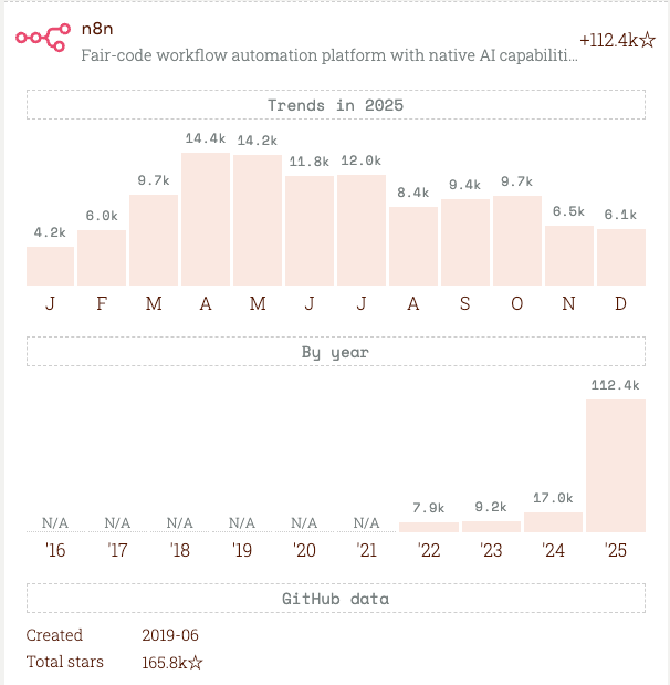 The most striking result this year is n8n. After adding around 17,000 GitHub stars in 2024 and finishing fifth overall, the workflow automation platform added more than 112,000 stars in 2025, ranking first by a wide margin. According to the Rising Stars organizers, no project has recorded that level of single-year growth across any previous edition.