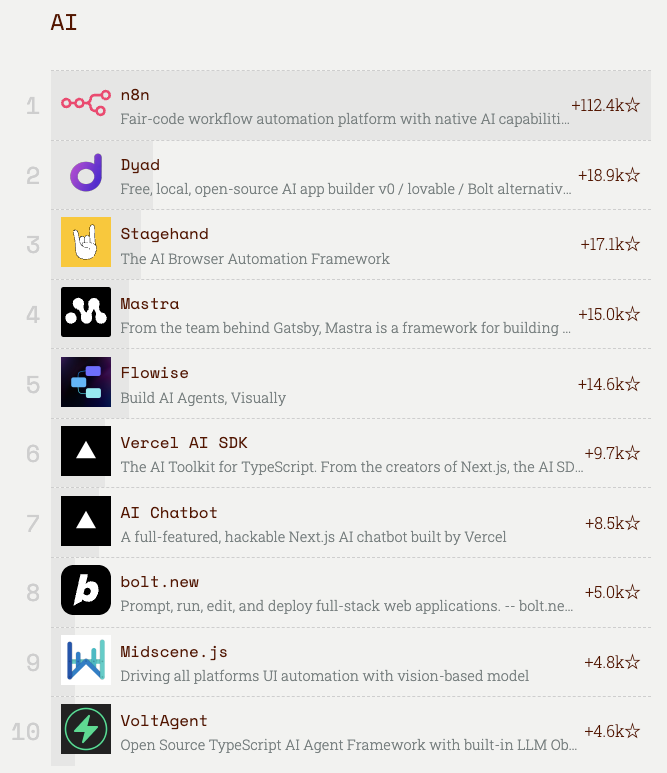n8n was not alone. Other fast-growing projects in 2025 also climbed into prominent positions in the rankings. Stagehand ranked among the top ten overall after strong growth in browser automation tooling. Dyad and Motia also posted substantial gains, reflecting increased attention to local-first AI application development and backend frameworks built around long-running workflows and orchestration.