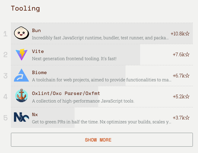 Tooling rankings in 2025 were shaped less by a broad shift across the JavaScript toolchain than by Bun’s breakout year. In 2024, Biome, Bun, and Vite were closely grouped, each addressing different layers of the toolchain. In 2025, Bun pulled ahead following a year of increased Node.js compatibility work, broader ecosystem support, and its acquisition by Anthropic.