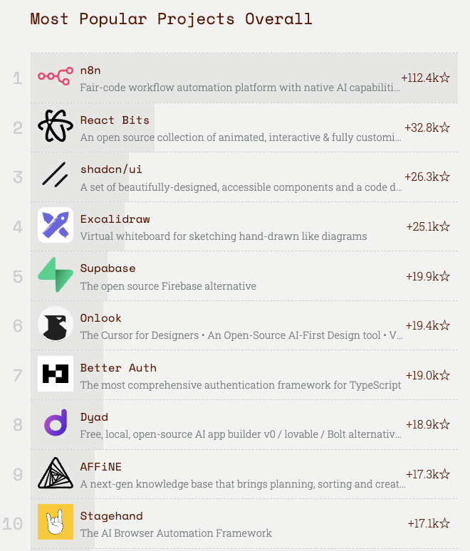 This marks a contrast with 2024’s results. Last year’s overall leaders included shadcn/ui, Excalidraw, AFFiNE, and Bruno. These projects sat close to the user interface and developer experience layer, emphasizing composition, customization, and productivity while building applications.