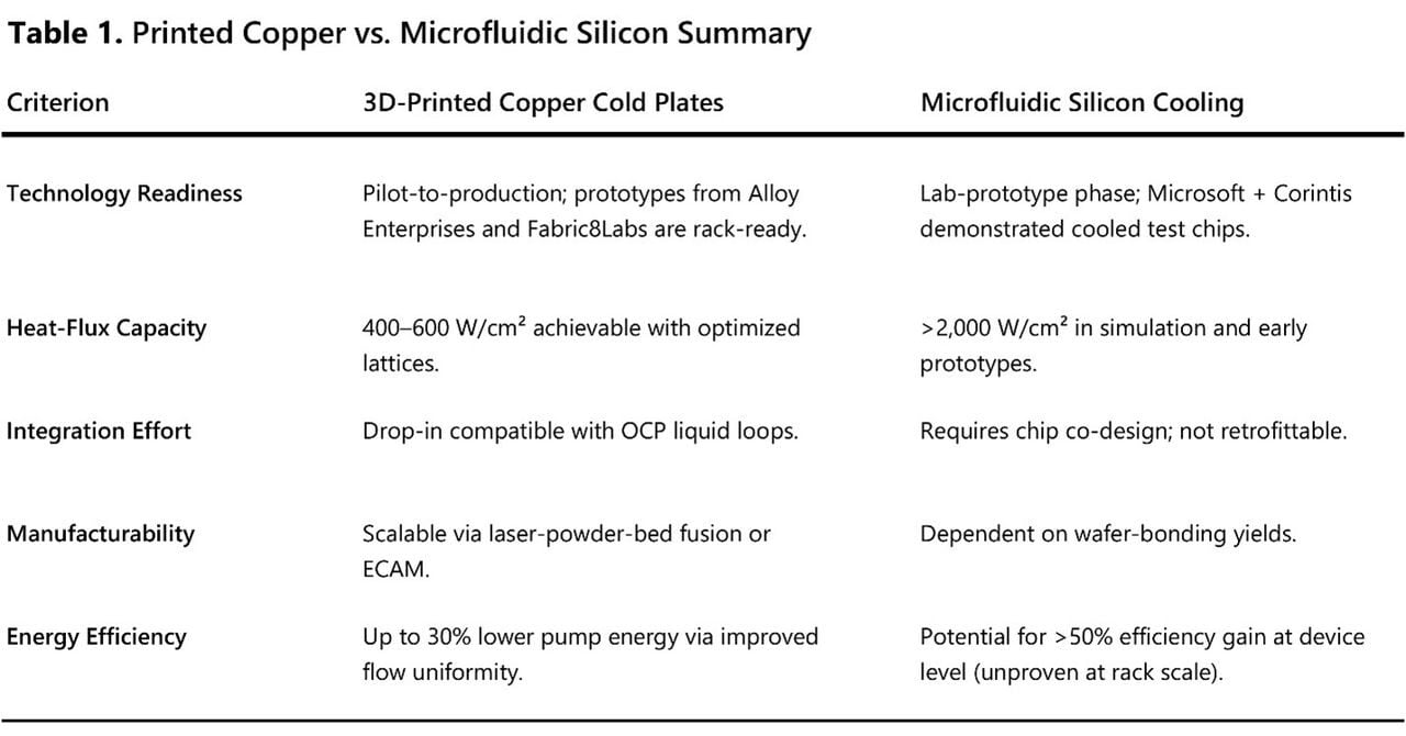Data centers are entering a new thermal reality. 3D-printed copper provides the bridge from today’s systems to the next generation, offering immediate, manufacturable gains. Microfluidic silicon points toward the long-term horizon, where heat removal becomes intrinsic to the processor.