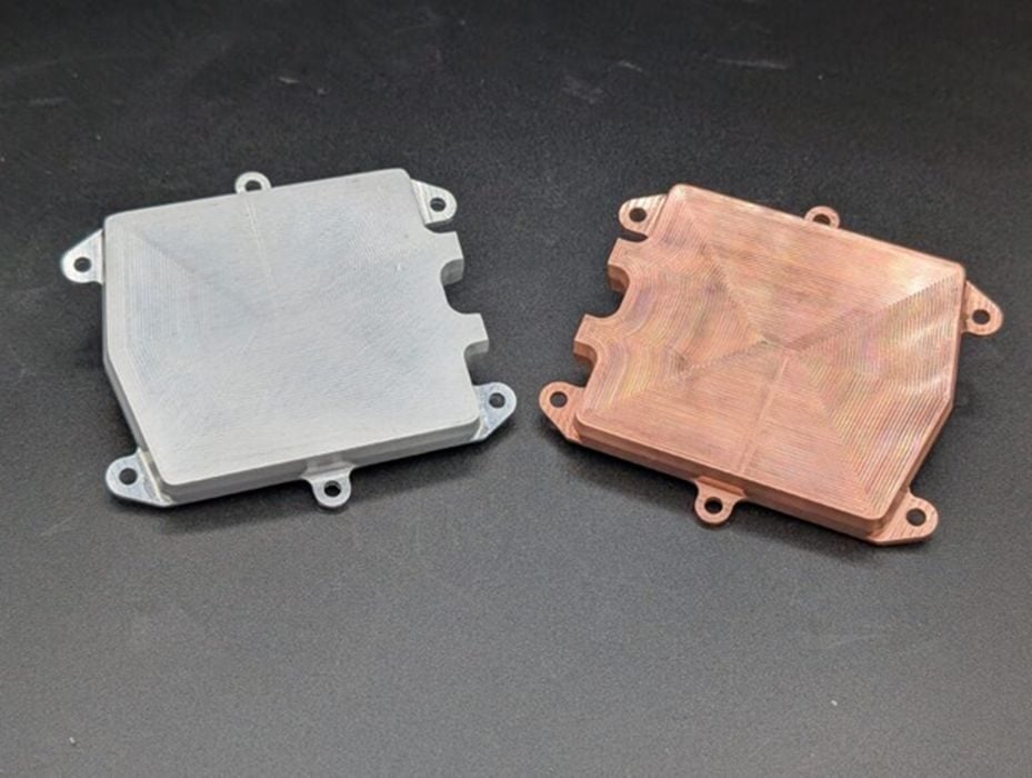 Figure 2. Alloy Enterprises’ single-piece, leak-tight aluminum (left) and copper (right) cold plate components demonstrated ~4.35 kW dissipation at 4 L/min PG25; ~33% lower flow than OCP’s baseline for equivalent cooling. (Source: Alloy Enterprises)