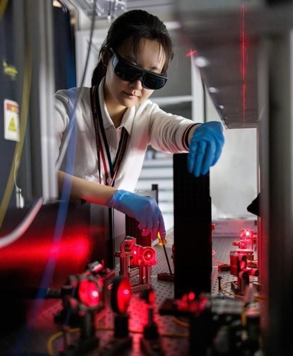 Graduate student Zixi Li, working in the lab of UChicago PME Prof. Alex High, is developing scalable hardware for quantum networking. (Photo by John Zich) [Source: UChicago]