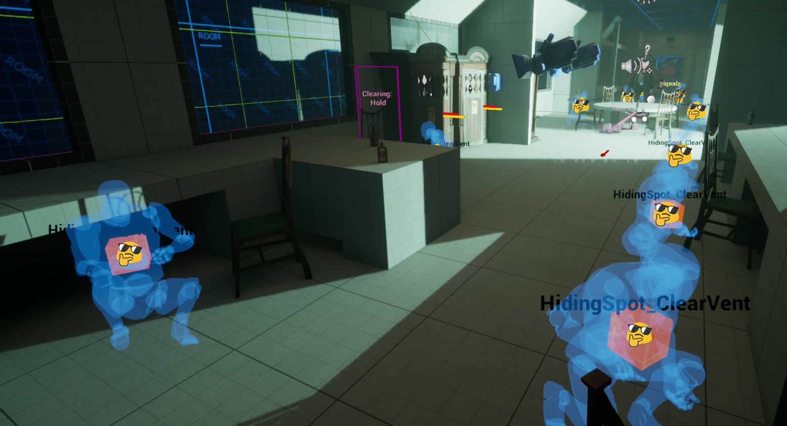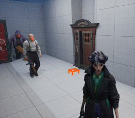 In a stealth game, obvious examples are things noises, corpses, blood decals, and doors that have been left open by the player, and these can be thrown around pretty effortlessly this way. DoorLeftOpen, for instance, is just “the door spawns an interest source when the player opens it and deletes it if it closes again”. DoorLeftOpen can even contain the behaviour of the NPC closing the door again. Less obvious examples might be things like kicking a table over during combat to use as cover, or, when idle, a group of guys sitting around playing poker. We even support individuals breaking off from one interest source to investigate another without canceling the original, so in that example, you could distract only one person from the poker game without everyone suddenly standing up, but if you distracted all but one person, the remaining person would also stop playing.