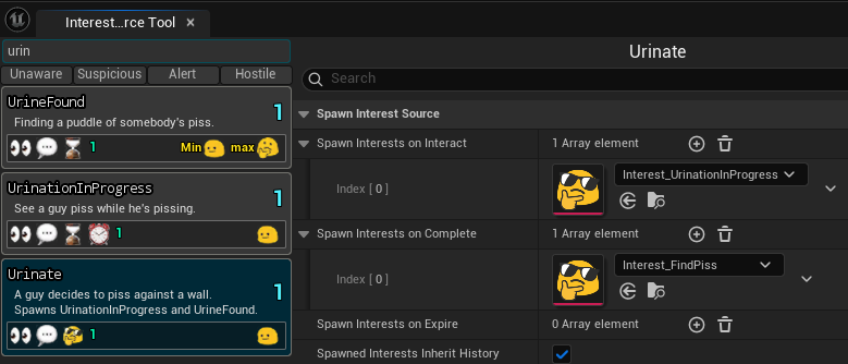 If a second NPC sees this NPC actively pissing, we want them to react with disgust, so as soon as the pissing begins, Urinate spawns the interest UrinationInProgress. UrinationInProgress will naturally remove itself when its parent interest concludes. SpawnedInterestsInheritHistory here means the pisser will be ineligible to perceive the spawned interest sources, because he already knows about them – “do not cite the piss to me, witch”.
