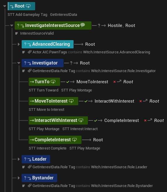 Once perceived by enough eligible pawns, the ISC kicks off, the NPC’s StateTree pulls this data, and we move through a few generic States that early-out if inapplicable to the particular interest source. Interests are immediately canceled if their requirements suddenly fail (eg: our alert state ascended beyond the interest’s max), and all of the interest source’s events (Activate, Interact, Cancel, Complete, etc) are bindable from elsewhere.