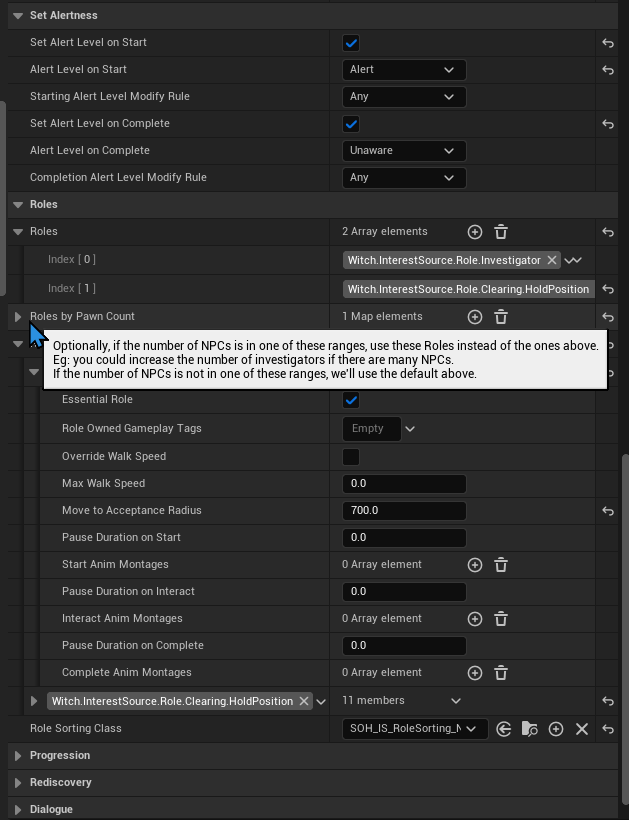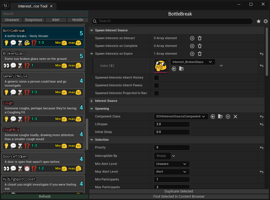 An interest source can be spawned in the world at any time as an InterestSourceActor (mostly just a container for an InterestSourceComponent). When spawned, the interest source does nothing until it’s Perceived by the right number of eligible pawns. Eligibility is subject to a lot of checks, mostly defined here – tags, alert levels, etc. The UI above is used to view and edit the actual **Interest Data **the ISA is spawned with. This is a lump of information about things like: