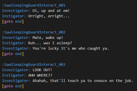 As with the quest system I described in another post, this data-centric approach keeps your code and maintenance burden from ballooning, while also explicitly supporting the ballooning of your design aspirations. But even cooler is what it makes easy by making it generic, like: elaborate behaviours coordinated between multiple NPCs at once. In SOH’s system, we have a concept of “roles”, where multiple NPCs can participate in an “investigation” of an interest source. Each role can contain different behaviour. A simple example might be: