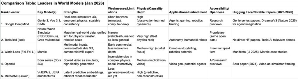 Include JEPA/V-JEPA evals, DreamerV3 (Nature agent imagination), IntPhys benchmarks (intuitive physics), and robotics-focused (NVIDIA/GR00T integrations). The field shifts from LLM scaling to”embodied/world-grounded scaling. DeepMind/Tesla lead deployment. World Labs/AMI innovate conceptually.