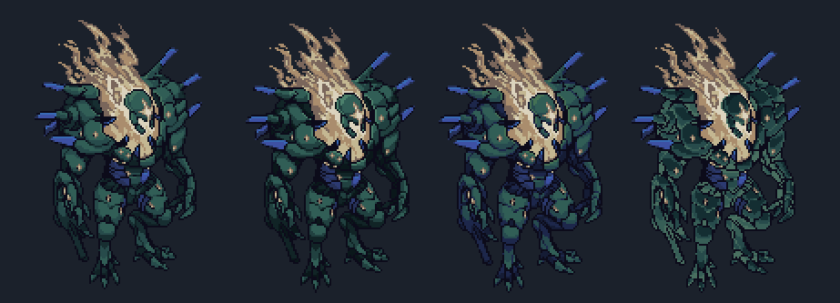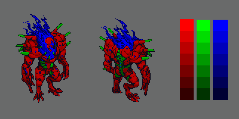 Also shown above are our red/green/blue “index” color palettes. These are sequences of seven pixels of various lightnesses. The color of the index pixel on the mech indicates what channel a pixel belongs to (i.e. should it be set to our primary, secondary, or glow color) and its lightness (i.e. darker reds will end up being darker). Pretty straightforward so far!