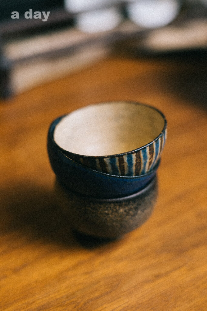“วันที่เราได้มาเป็นวันที่เรานั่งคุยกับพี่ป๊อบ – ปานชลี สถิรศาสตร์ ศิลปินนักปั้นยาวนานมาก นานจนเขาชวนไปที่บ้าน เราถึงได้เห็นคอลเลกชันถ้วยสีนิลของเขา เรากินข้าวด้วยกัน ดื่มชาด้วยกันทั้งวันไม่ขยับตัวเลย ไม่ได้เจอเขานานแล้ว มองแล้วก็คิดถึงเขานะ เขาเป็นคนอบอุ่นมาก