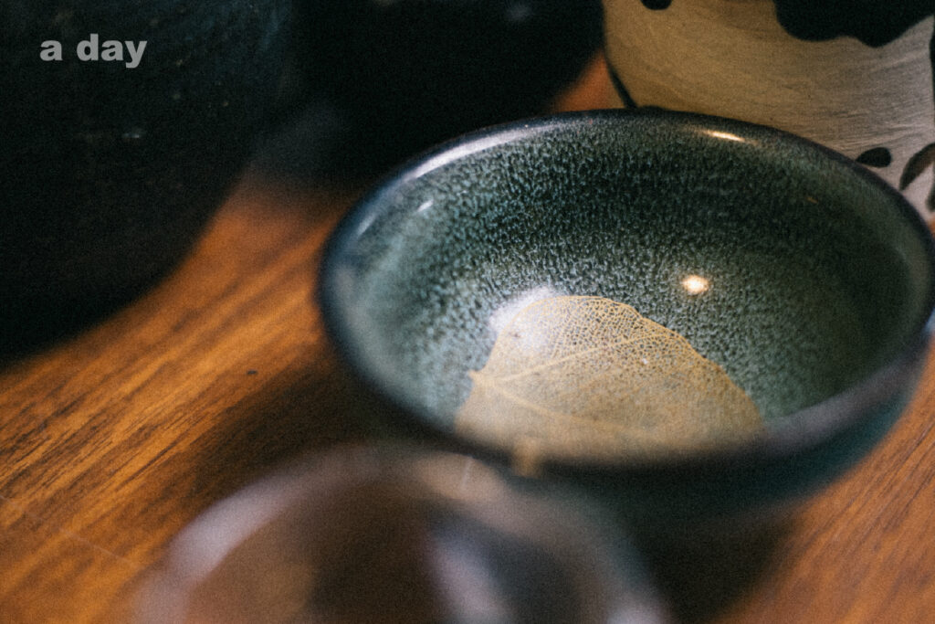 **“เสียงในหัวคอยบอกว่าเดินเล่นไปเรื่อยๆ เดินอีก เหมือนมีอะไรรอเราอยู่ แล้วก็เจอร้านหนึ่งที่มืดๆ เงียบๆ เจ้าของเป็นคุณยายอายุเก้าสิบกว่า เป็นร้านขายจอกสาเก กาชา จริงๆ ก็ตั้งใจจะไปดูเฉยๆ ไม่ได้ซื้อ แต่พอเข้าไปในร้านต้องร้องอือหือ! ถ้าไม่ซื้อคงรู้สึกผิด เราก็ได้จอกสาเกใบนี้มา” **แล้วน้ำในกาก็ส่งเสียงเดือดปุดๆ อีกครั้ง จูเลี่ยนยกมันขึ้นอย่างคล่องแคล่วไม่ยักกลัวไอร้อน เขาเทน้ำเปล่าลงในถ้วยที่เต็มไปด้วยใบชา แล้วน้ำก็ล้นจนดันใบชาขึ้นมา