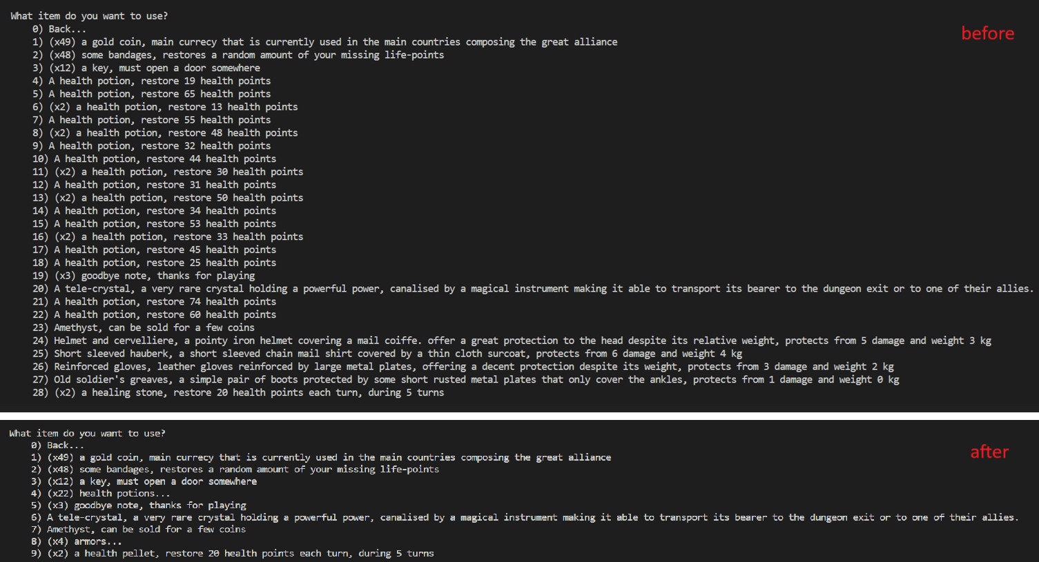 I also added a shortcut system that allow you to map inputs to items in your inventory, allowing you to use these items by writing these inputs during combat or exploration without the clunky navigation through the inventory every single time. Especially usefull for items you’d regularily use and would get tired to navigate to every single time, like the teleporter.