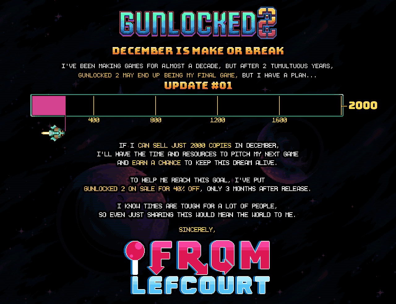 Being a indie developer can be fraught with difficult challanges, none of which are any less important then the need to promote and get exposure for ones game. In this regard he is reaching out to the gaming public in last ditch effort to raise enough money in december to continue. As of Dec 7th, he has met 10% of his goal of 2000 units! If you enjoy excellent action mixed with outstanding strategic elements please take advantage of the 40% off sale and check out Gunlocked 2!