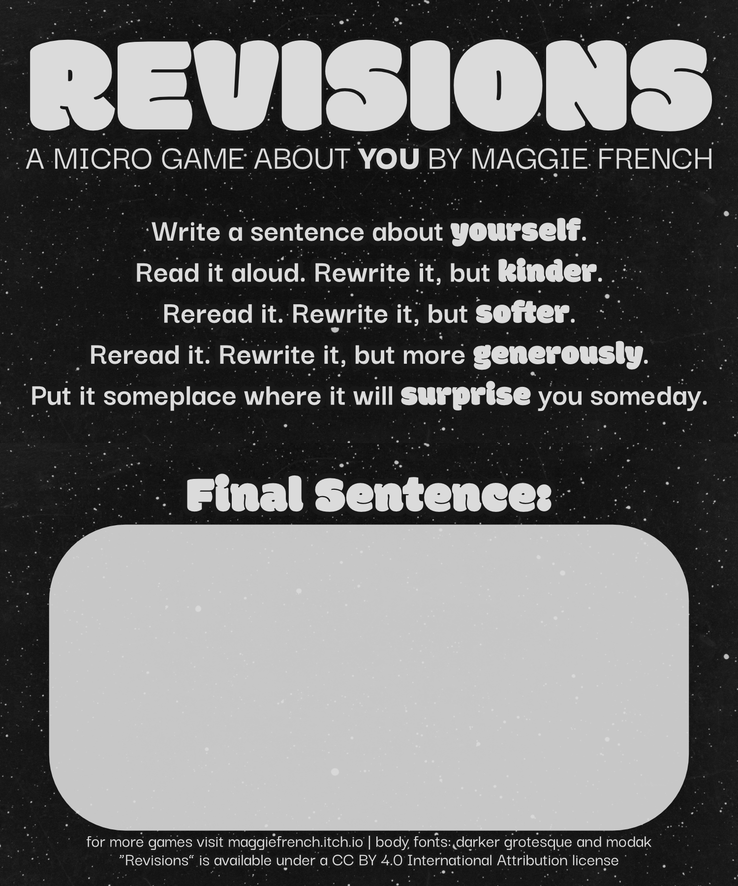 One of the most interesting parts of changing your penname (Maggie Mahoney >> Maggie French) is that you need to update a lot of old game files, and it can be a great opportunity to reimagine the game formats themselves. In this case, while updating my name and links on the game, I decided I wanted to take the layout for Revisions out of Canva and do it in Affinity 2, the software I now use to do my layout work.
