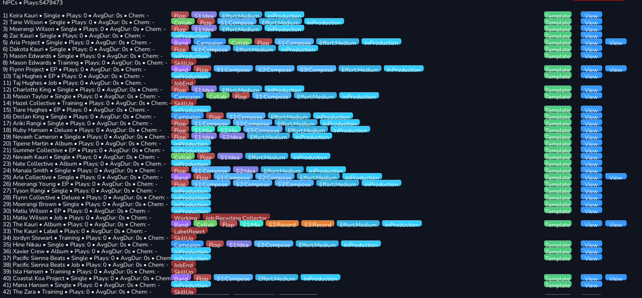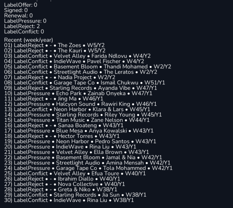 Every NPC artist is a simulated musician with skills, moods, relationships, and a career trajectory that evolves over time. My goal is to make the industry feel reactive—where quality, momentum, and chaos emerge from systems, not scripts.