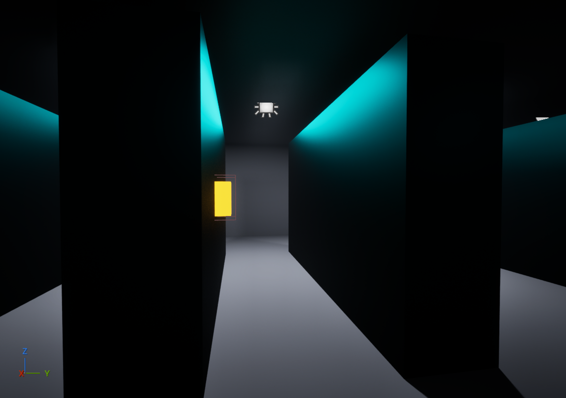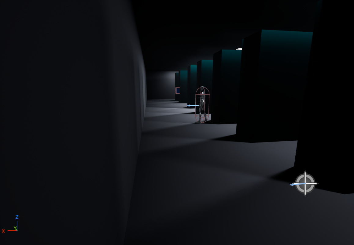 I played around with brightness a little, but not as much, mainly to give the world an overall consistent look and to emphasize some important areas. One example of this is in the back of the security office is a server room, and there’s a button to be pressed in there, I tried having the lights get progressively brighter around it to lead the player toward the spot and find the button.