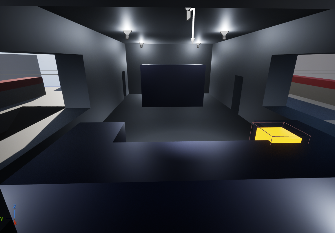 To start I’ll go over the lighting in the game. I went pretty simple and still couldn’t quite get the lighting to achieve the effect I was going for, this is a big part I’m still learning. My main focus was on readability and visibility in most sections of the map. I wanted shadows to be minimal so that the layout of the terrain and objects was clear, making potential hiding spots and routes clear to the player. Included here is an image of the main open area of the ship, where I removed shadows to allow the areas around the boxes and on the floor to be more visible allowing for the player to more clearly see where they are at, where enemies are, and where they can go.