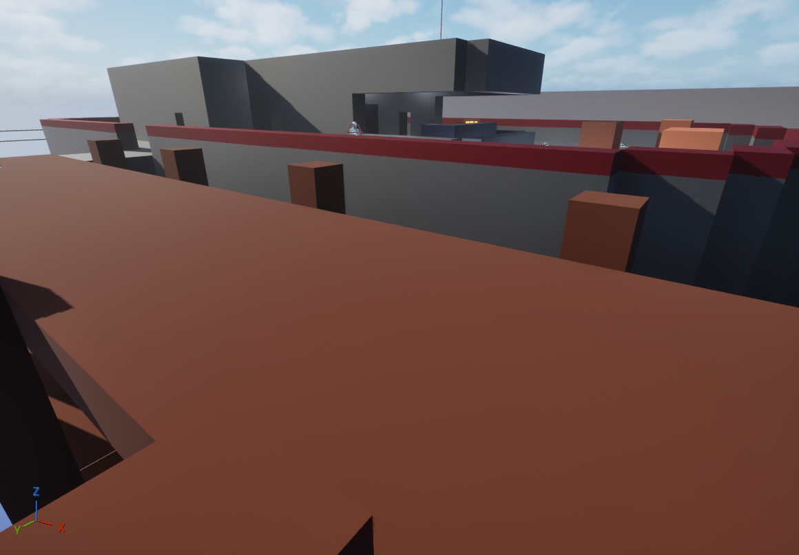 To start I’ll go over the lighting in the game. I went pretty simple and still couldn’t quite get the lighting to achieve the effect I was going for, this is a big part I’m still learning. My main focus was on readability and visibility in most sections of the map. I wanted shadows to be minimal so that the layout of the terrain and objects was clear, making potential hiding spots and routes clear to the player. Included here is an image of the main open area of the ship, where I removed shadows to allow the areas around the boxes and on…