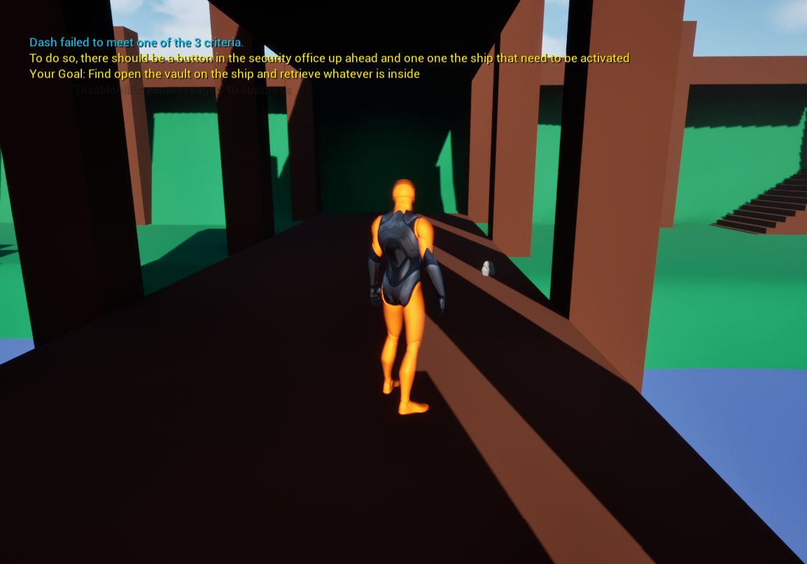 In terms of UI there wasn’t really much for me to do, I didn’t get around to adding a main menu, and the pause menu is still that of the old menu given in the project and will reset the level, this is partially due to me not knowing how to make the functionality better for these. But there wasn’t really any need for an in-game UI besides the messages in the upper left (I don’t remember what that section is called. I did use various text colors to try to increase readability and hopefully drawing the players attention to more important messages, Here’s one example of such. Its starter text to give the player directions as they enter the level, using a bright yellow and staying on the screen longer to draw the players eyes as it differentiates itself from the typical blue most text uses and giving the player time to read it.