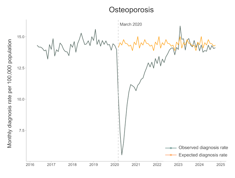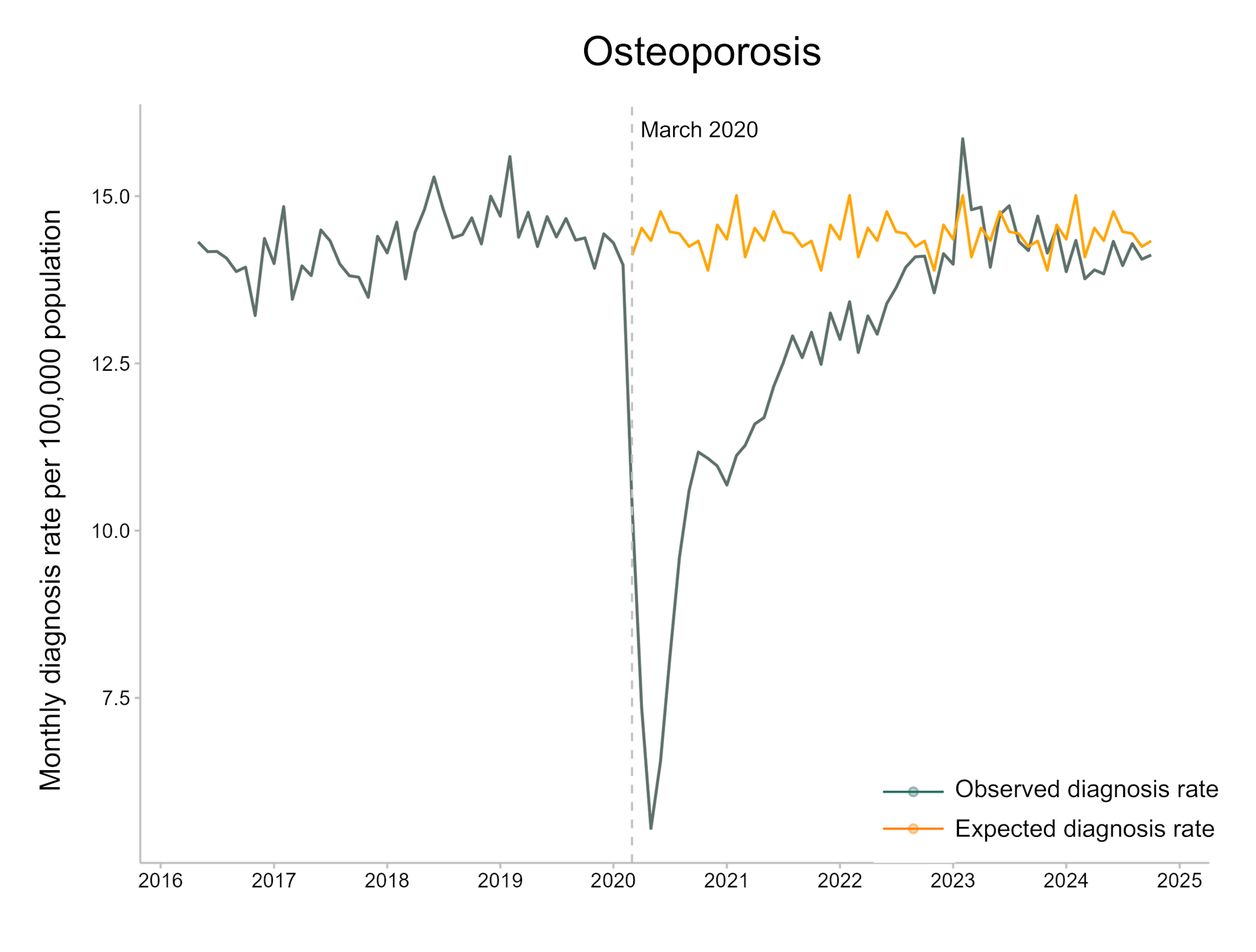 New diagnoses of osteoporosis fell by a third early in the pandemic and did not return to expected levels for almost three years. As a result, more than 50,000 fewer people than expected were diagnosed with osteoporosis in England between March 2020 and November 2024.