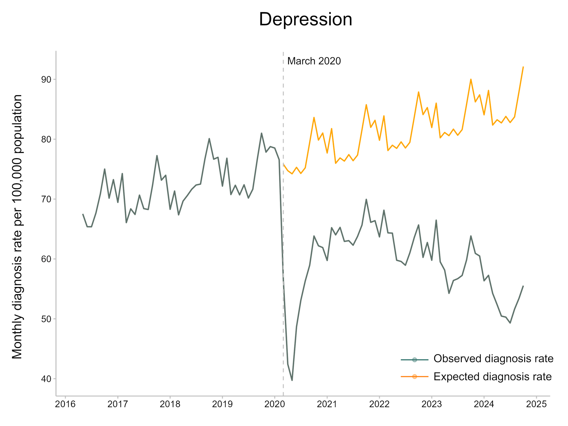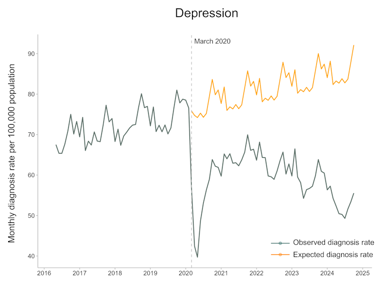 New diagnoses of depression fell by nearly 30% in the first year of the pandemic. Rates then partially recovered, but have dropped again considerably since 2022. This does not necessarily mean that fewer people are experiencing symptoms of depression. A doubling in the number of disability claims for mental health conditions in England between 2020 and 2024 suggests otherwise.