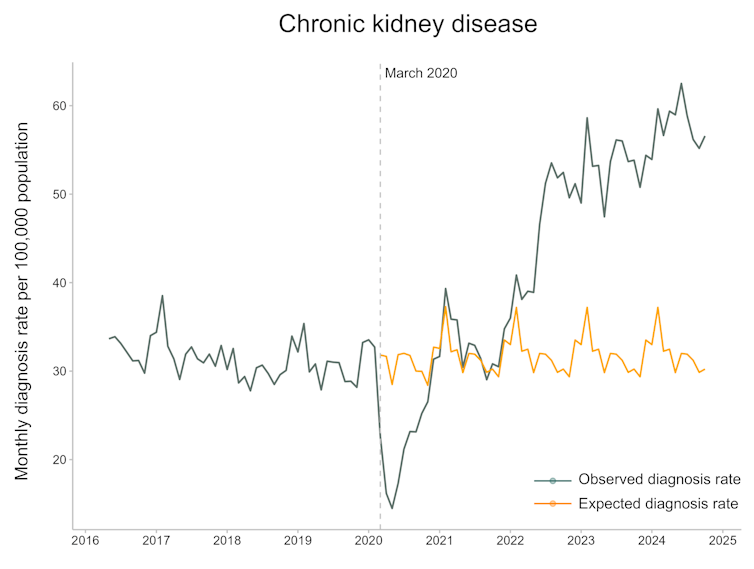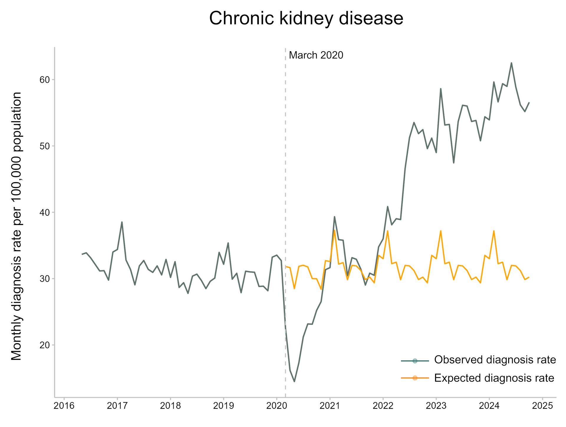 Chronic kidney disease shows a very different pattern. Diagnosis rates have doubled since 2022, making it one of the few conditions in the study to have increased above pre-pandemic levels. There are several different ways of interpreting this finding.