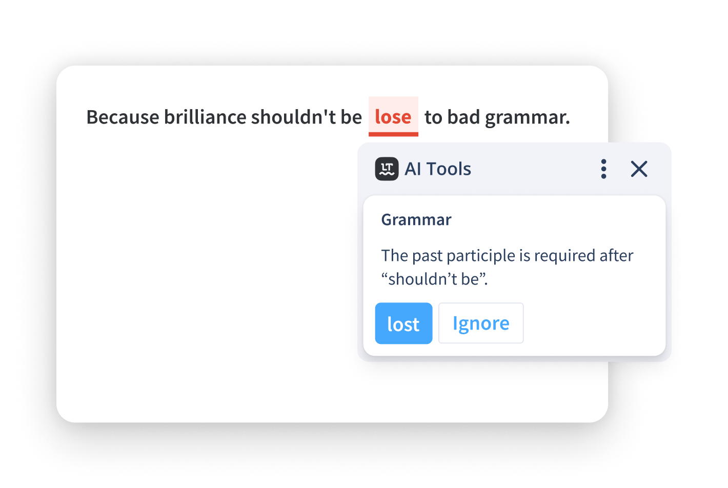 Use our more advanced AI-based grammar checker to instantly fix problems with agreement, word choice, and commas.