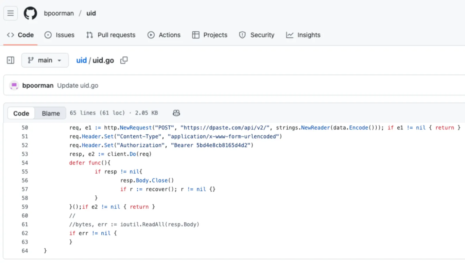 Excerpt from the threat actor’s github[.]com/bpoorman/uid repository showing the uid.go exfiltration code that issues an HTTP POST to hxxps://dpaste[.]com/api/v2/ and sets a hardcoded header Authorization: Bearer 5bd4e8cb8165d4d2.