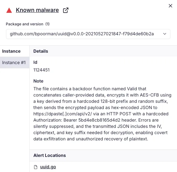 Socket AI Scanner’s analysis of the malicious github[.]com/bpoorman/uuid package shows that a hidden Valid function behaves as a backdoor, aggregating caller-supplied data, encrypting it, and sending the resulting payload to hxxps://dpaste[.]com/api/v2/ over HTTPS using a hardcoded bearer token for covert data exfiltration.