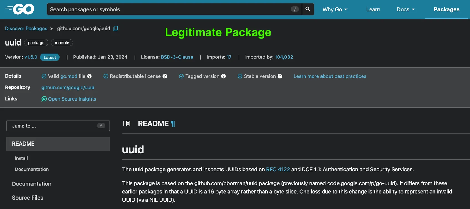 The malicious package github[.]com/bpoorman/uuid typosquats the maintainer name (pborman versus bpoorman) while keeping the /uuid suffix, which closely matches what developers expect after seeing pborman/uuid and google/uuid in tutorials and official examples. Their popularity makes the legitimate UUID packages attractive targets for supply chain attacks.