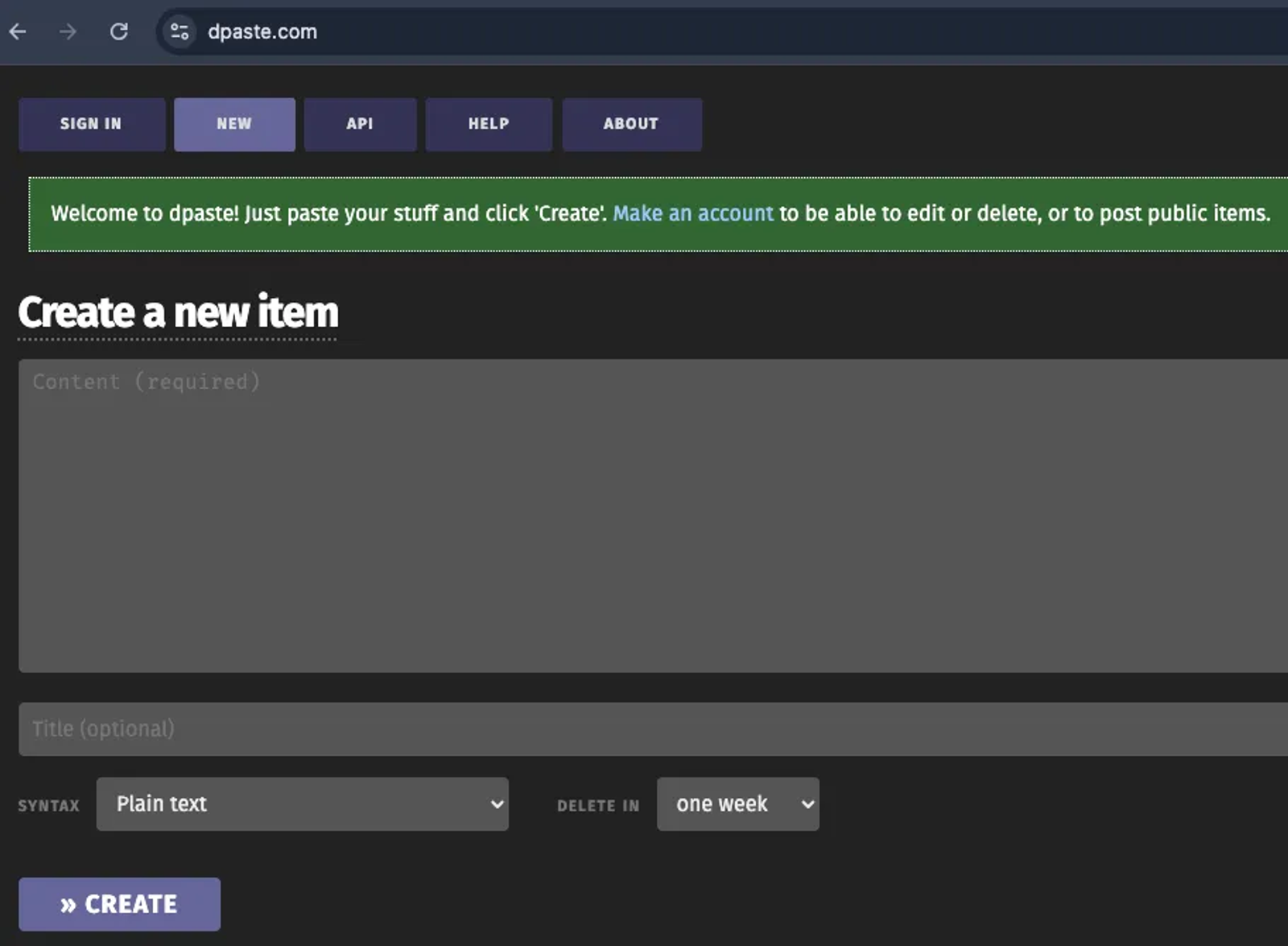 “Create a new item” dpaste.com interface, the same paste service whose API the malicious github[.]com/bpoorman/uuid and github[.]com/bpoorman/uid packages abuse to upload encrypted exfiltrated data using a hardcoded bearer token.