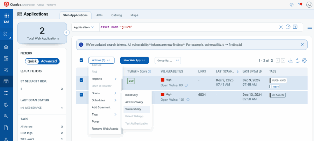 Customers can also run an on-demand or scheduled vulnerability scan with Qualys TotalAppSec or Qualys Web Application Scanning (WAS), enabling instant discovery of vulnerable web apps. From there, application owners can be identified to enable faster remediation.