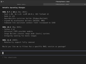 I sat back, pretty blown away. In that moment, the gap between “technical cool factor” and “business value” completely closed. I am now 110% convinced of the critical importance of the roadmap data inside Insights and Lightspeed. I’ve told customers before, if we execute this right, you won’t need to call me for a roadmap in RHEL 11, you’ll be able to look at it yourself. Admittedly, I didn’t quite think they’d do it from a terminal window, using English.