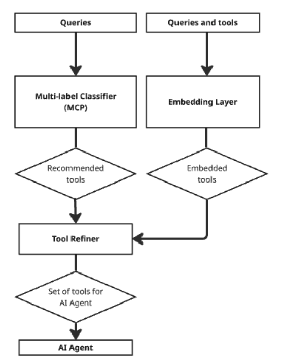 - Multi-Label Classification (MLC): Training a fast classifier (like DeBERTa) that takes a user query and directly predicts a set of relevant tools.