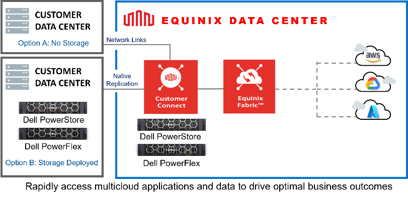 A key advantage of the Dell and Equinix architecture is deployment flexibility across on-premises and colocation environments. PowerStore or PowerFlex can be deployed exclusively in Equinix to centralize storage, simplify operations, and reduce the overhead of running traditional data centers. In this scenario, organizations may avoid frequent hardware refresh cycles and lower facility complexity by consolidating into cloud-adjacent infrastructure.