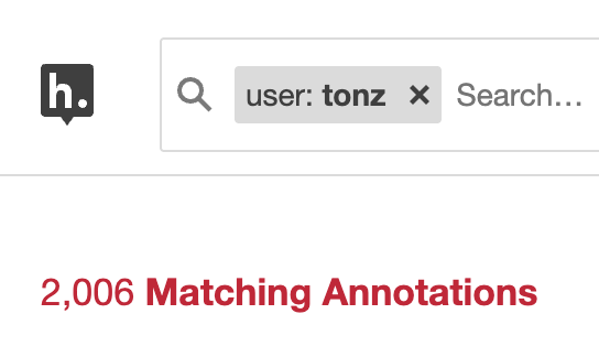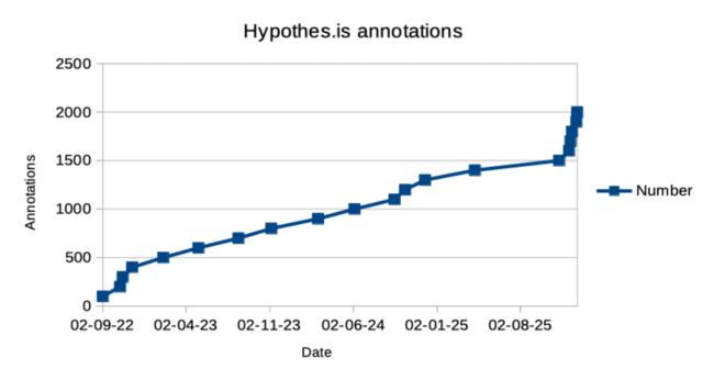 I’ve reached 2000 bookmarks and annotations in Hypothes.is. A large chunk of those 2000 bookmarks came this month, some 20% of them. Because, mostly I think, I’ve hit on the right mindset that makes bookmarking/annotating in hypothes.is a habit. Next to having a bit more energy and mental space in general than I had for a long time, that really helps too.