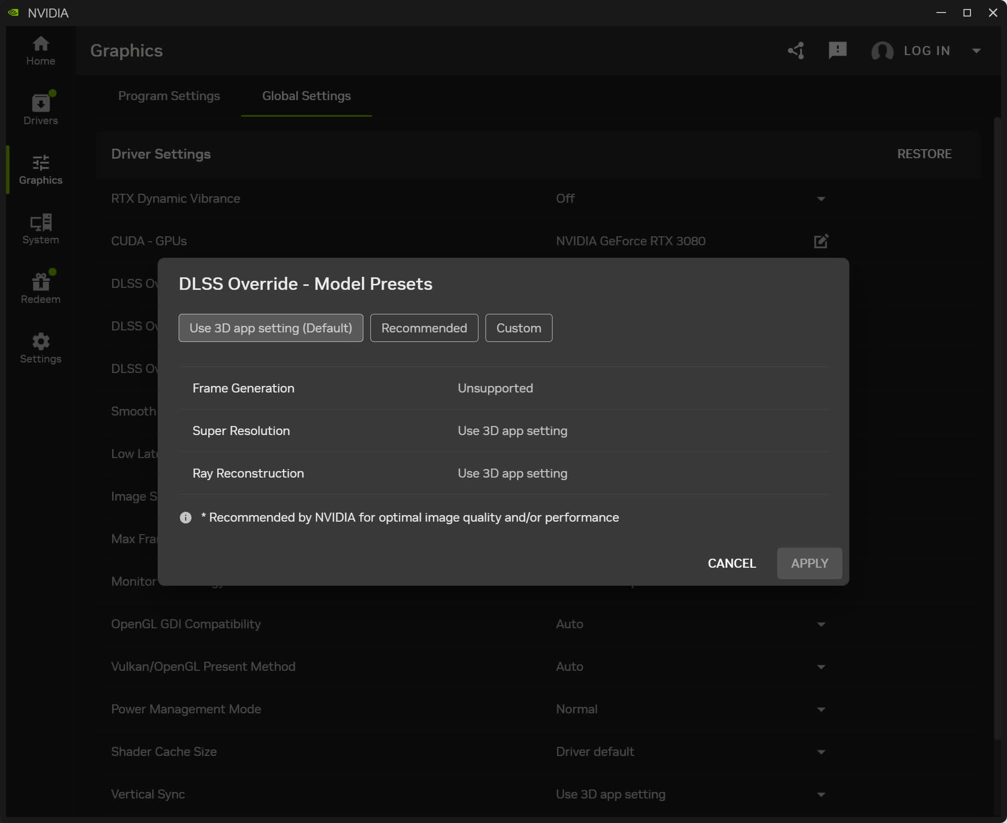 You can also do this globally across all titles, or use Nvidia’s "Recommended" setting – though be aware that using the Recommended mode only applies DLSS 4.5 to the Performance and Ultra Performance modes; in other modes, like Quality, it uses Preset K which is DLSS 4.0. You can verify that DLSS 4.5 is enabled by using the DLSS Statistics view in the Nvidia overlay, and looking for Preset M or Preset L on screen.