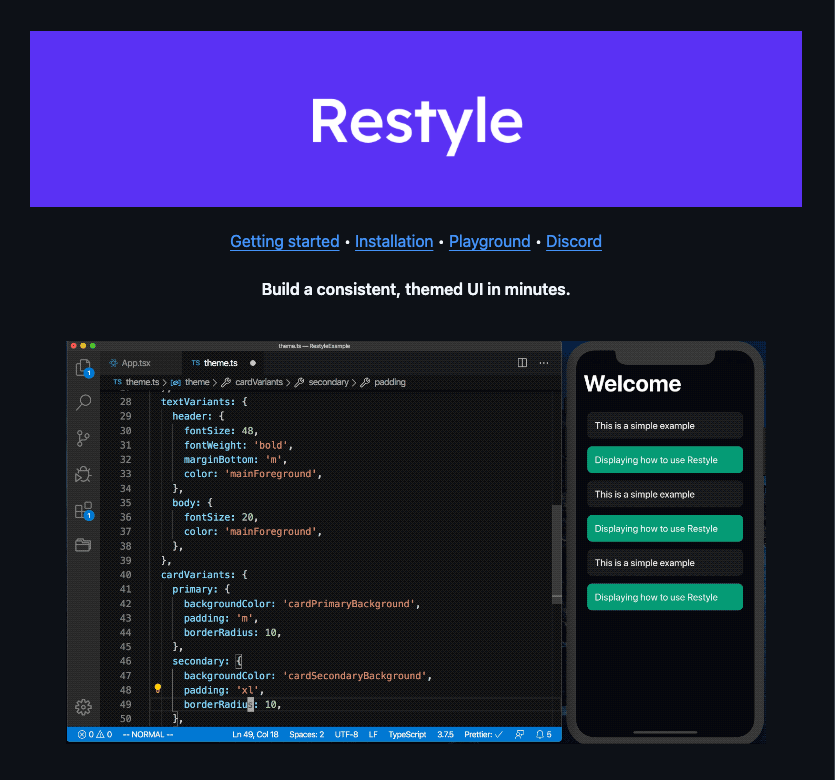 Restyle prevents “magic numbers.” If you define a spacing token like s as 8px in your theme, Restyle will surface a TypeScript error whenever you try to use an invalid value, such as 10px or m="medium".