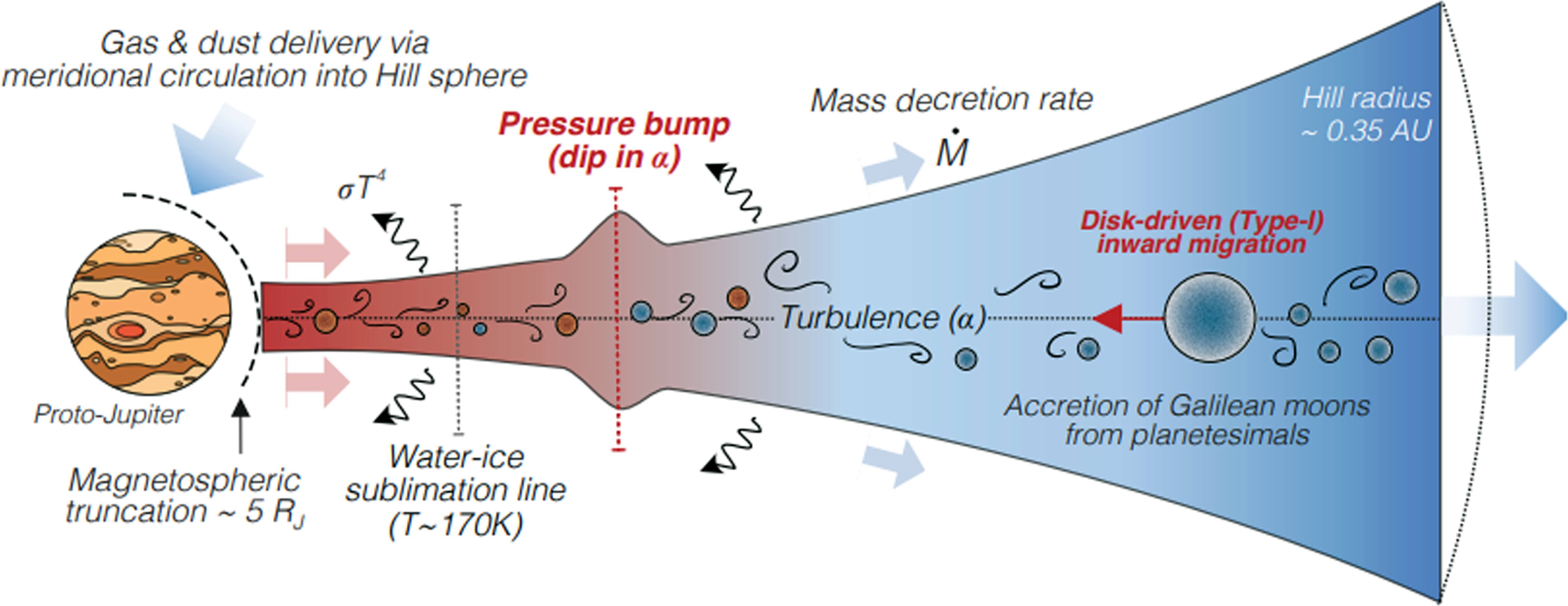 is driven by turbulence manifesting as a macroscopic viscosity, and parametrized by the Shakura–Sunyaev α parameter. The four Galilean moons are envisioned to form beyond the ice line and pressure bump, and undergo Type I migration inward. The bump serves as a migration trap, preventing Callisto from convergent migration into resonance with Io, Europa, and Ganymede.