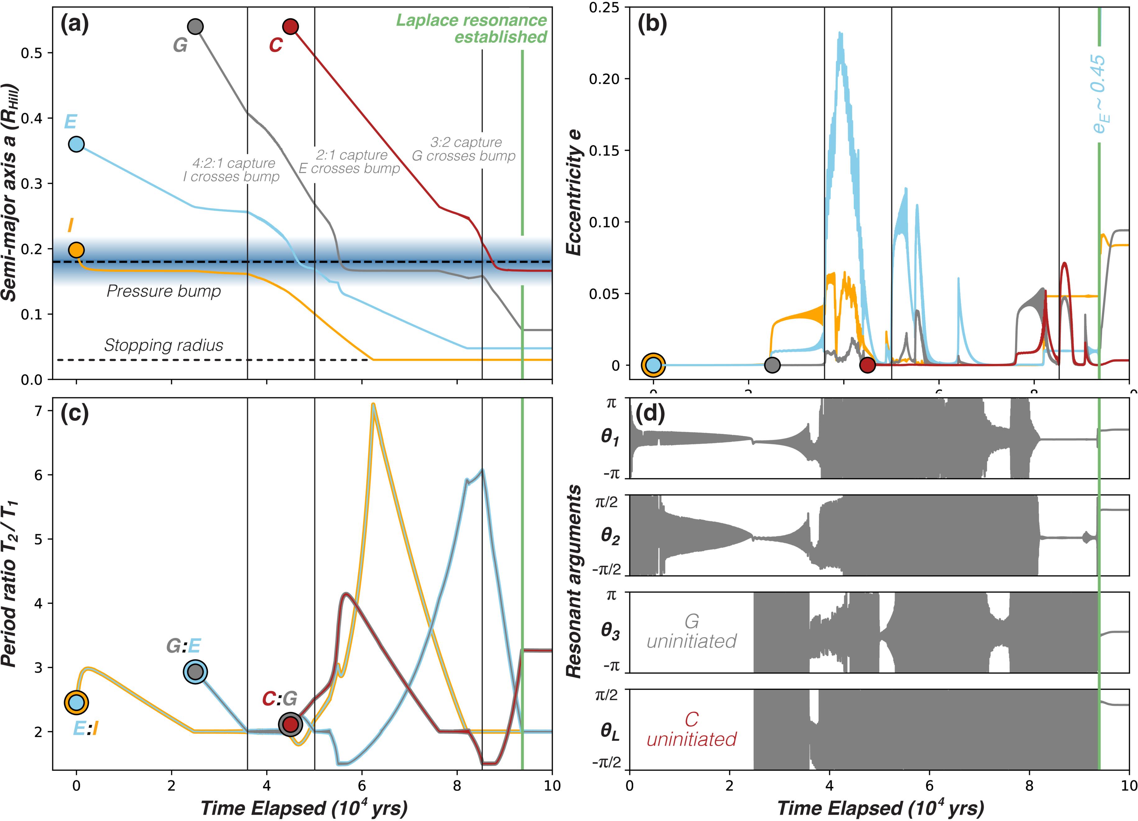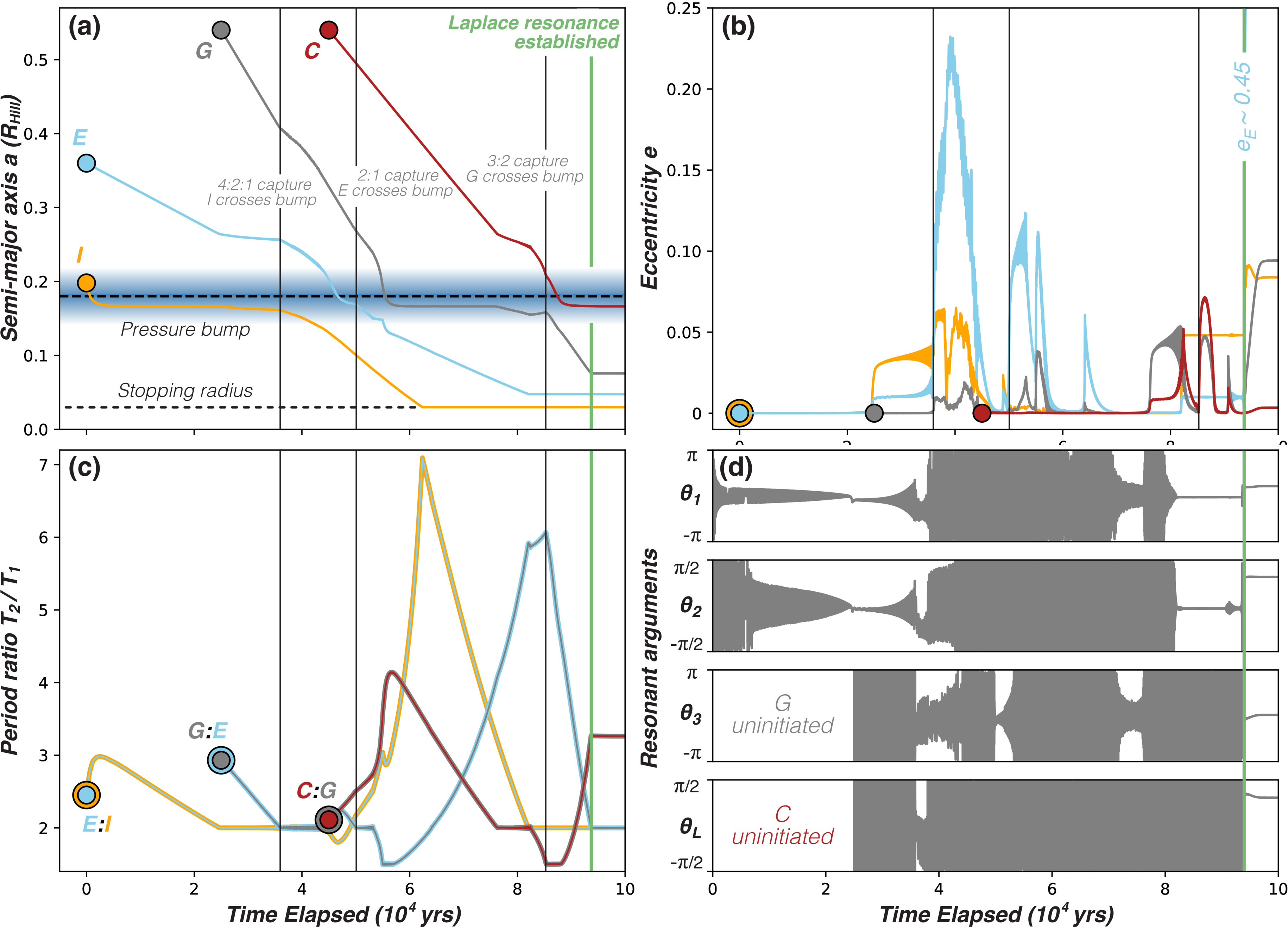 Soon after the start of the simulation, I is trapped at the pressure bump. At ∼25 kyr (when G is introduced), E captures I in a 2:1 resonance, “pushing” it across the bump in lockstep, albeit weakly given its small mass (see Section 2.3). At ∼35 kyr, G captures E into a 2:1 resonance, increasing the total torque on the three-body resonant chain and rapidly moving I past the bump. The steep, and thus rapid, climb of E up the bump at ∼45 kyr (when C is introduced) breaks the resonant chain, and leaves E trapped at its peak while I proceeds to migrate inward toward Rstop. In ∼5 kyr, G recaptures E into a 2:1 resonance and pushes it across the bump, leaving itself trapped. At ∼75 kyr, C captures G into a 2:1 resonance. As G is ushered down the bump, the torque driving it outward (i.e., back toward the peak) increases (due to the steepening profile) and eventually breaks the resonance. At approximately the same time, E enters the 2:1 resonance with I at Rstop. At ∼85 kyr, C recaptures G into the (stronger) 3:2 resonance and successfully displaces G short of ∼90 kyr. Finally, while C remains at the bump, G enters the 2:1 resonance with E, establishing the 4:2:1 Laplace resonance before 100 kyr.
